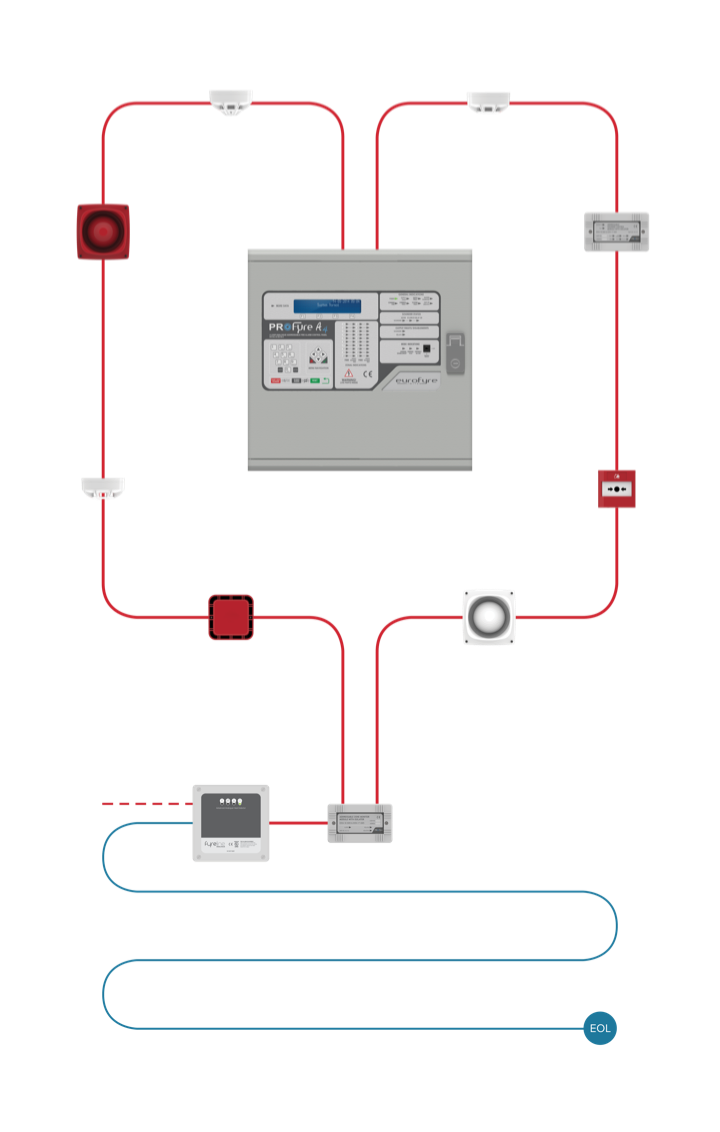 When using FyreLine Analogue Linear Heat Detection in conjunction with an addressable fire alarm system it should be connected onto the addressable loop using a switch or zone monitor. An external power supply is needed for the FyreLine control module.